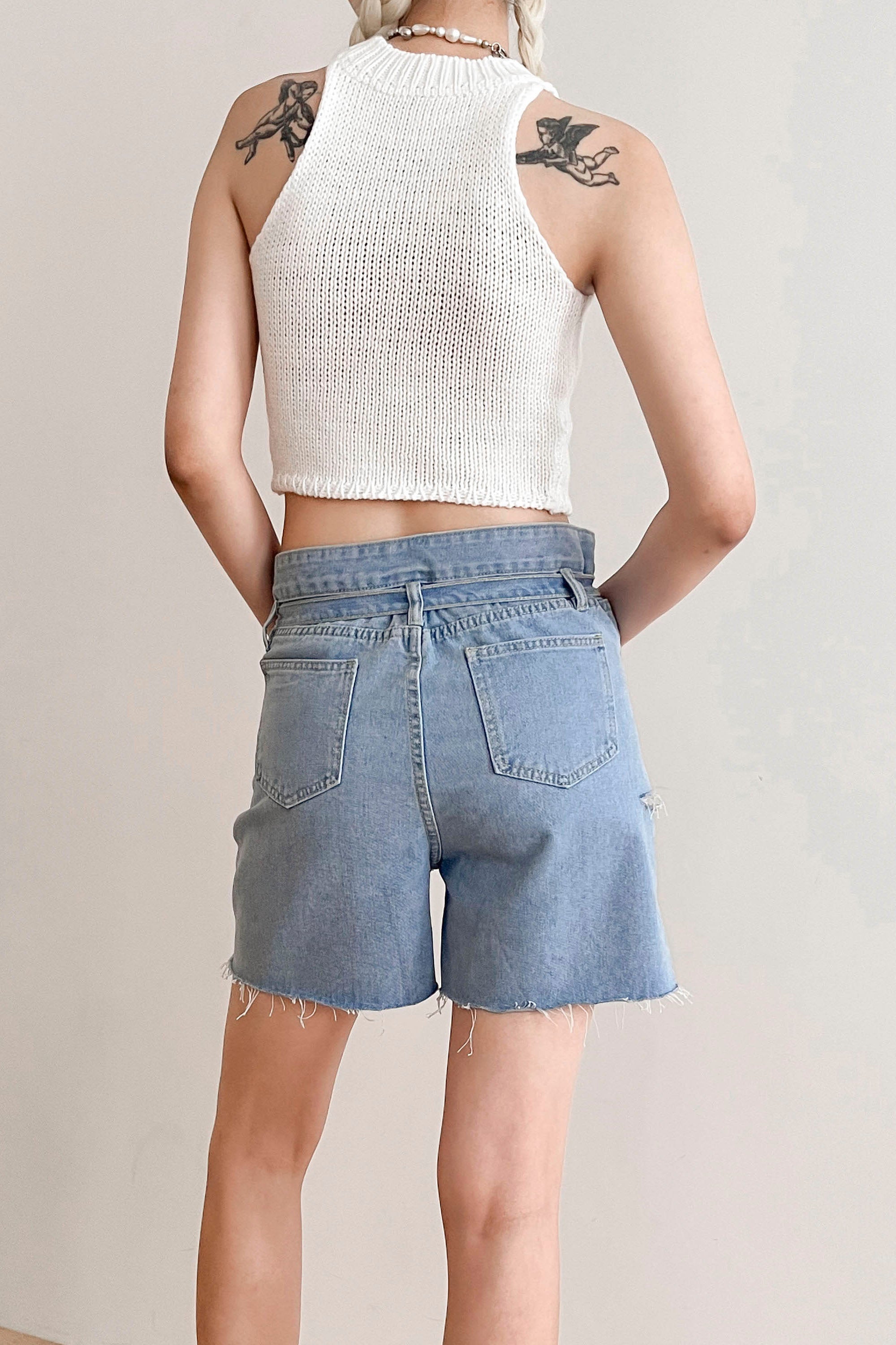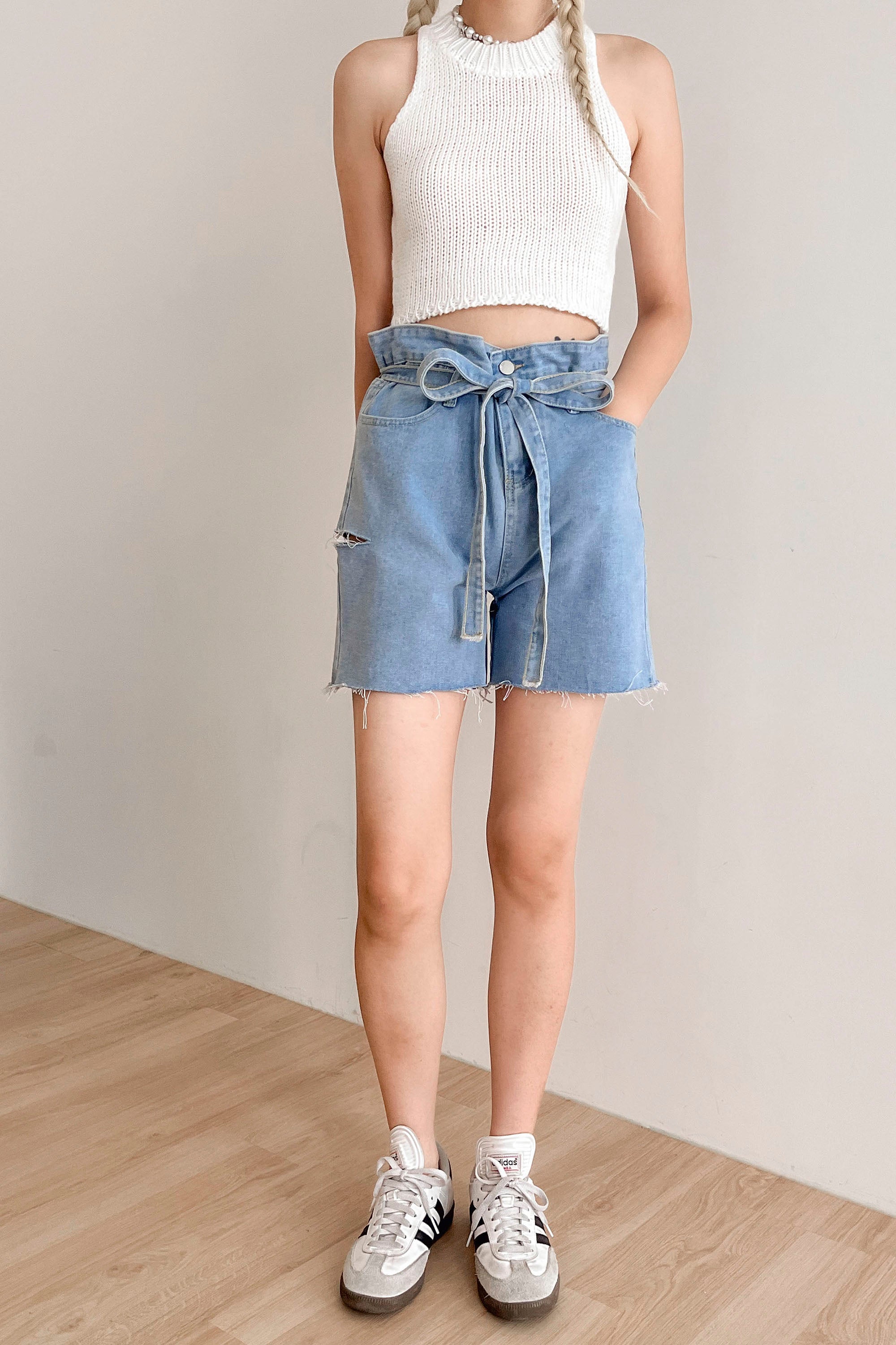 Luna Paperbag Denim Shorts Front zip fly Waist self-tie Loose fit Side cut out detail Raw edge hem Product Specification […]